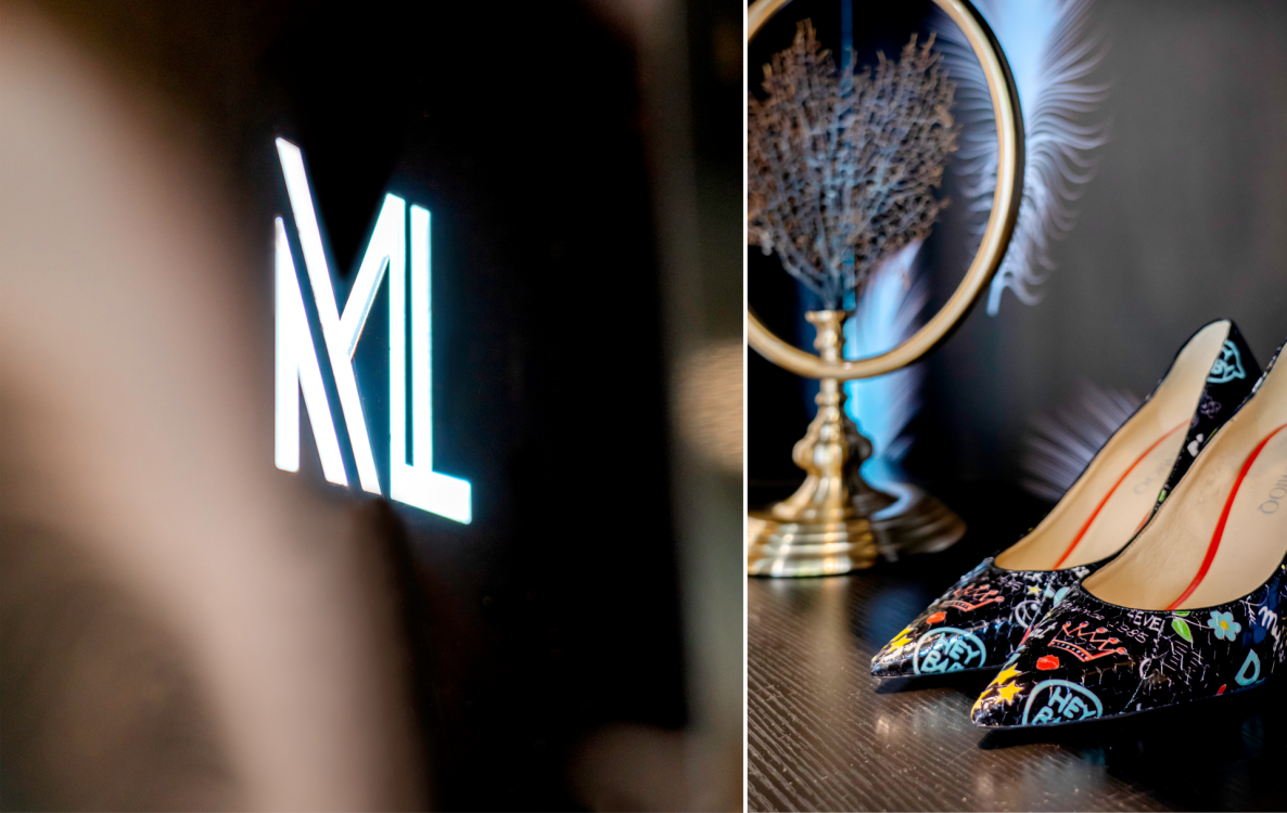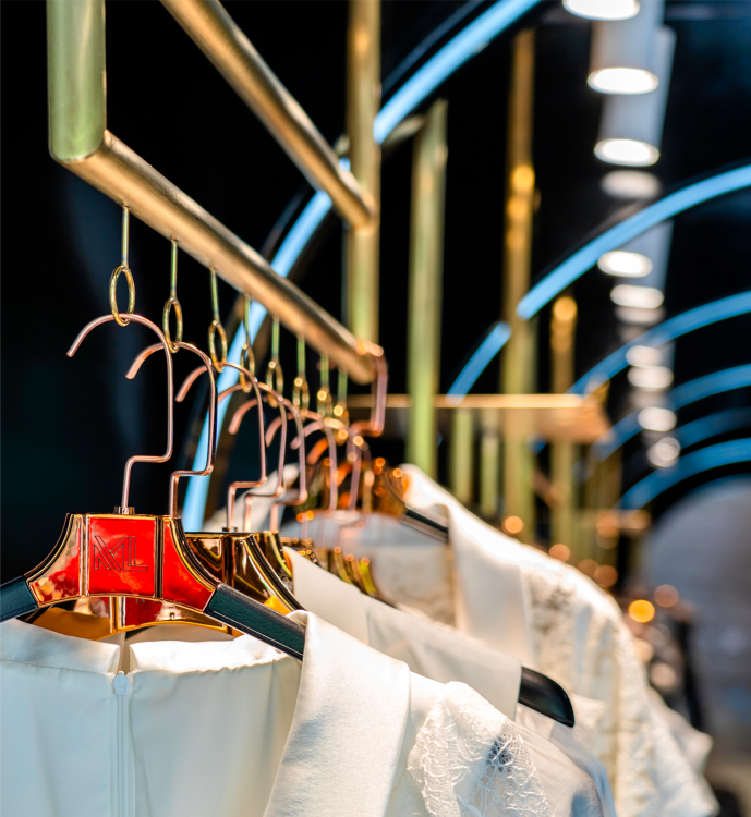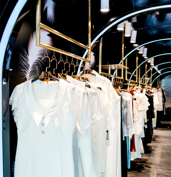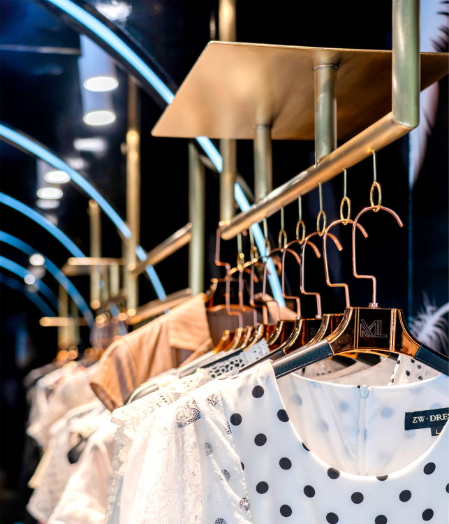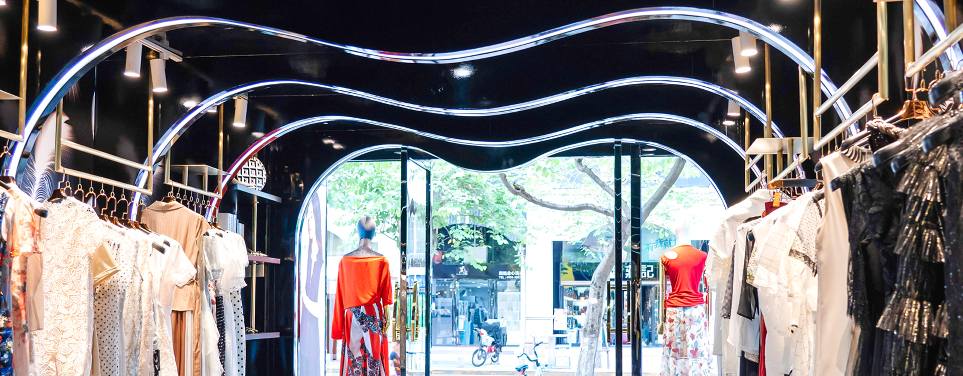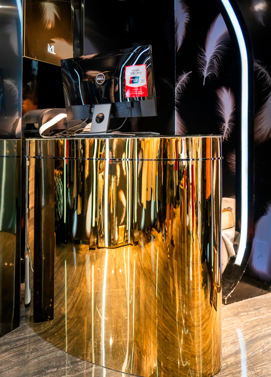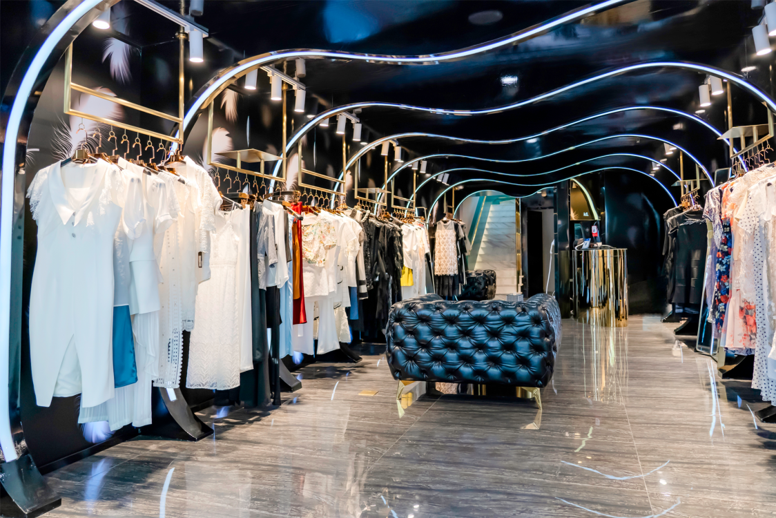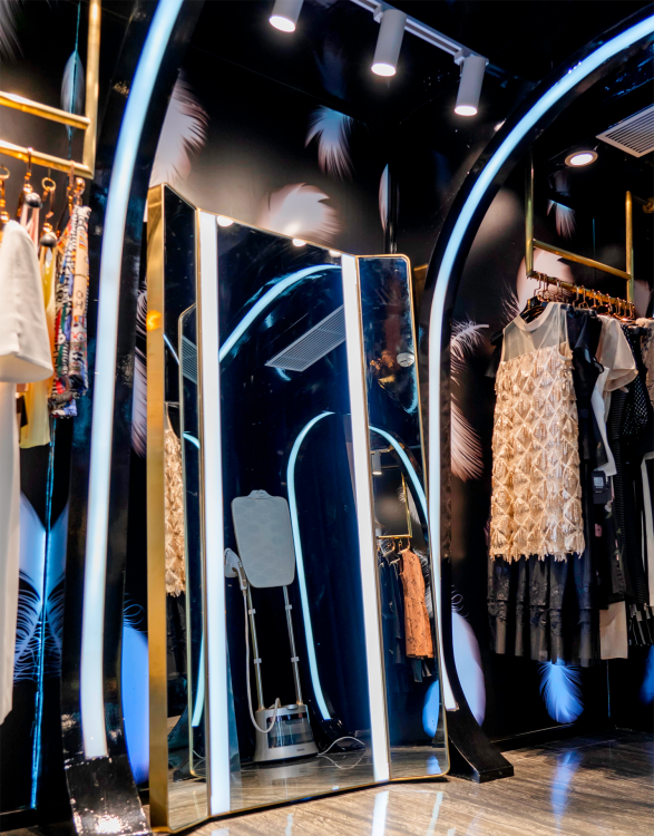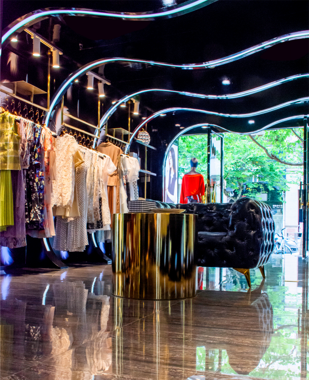 品牌林立的中国厦门商业空间禾祥商城中,本案受空间层高的限制,空间我们由此以“波浪式”造型弱化中岛部分,用黑色亮面汽车漆营造面,并辅以不同的造型弧度加上亚克力灯条变化,构成新的“黑洞式”空间形式,打通空间的延伸性和连接性,提升整体关注度。整个空间的色系我们以黑色为主,受空间面积的影响因此避开传统的中岛模式,营造一个一览无遗的“黑洞”空间,墙面的白色羽毛图形在亚克力透光板荡漾,配合暗藏的灯光投射在黑色吊顶若隐若现。道具设计上采用钛金拉丝,配合空间的暖色灯光让整体的空间更显温馨,前台设计采用亮面钛金配合灯光效果,投射出地面的黑色木纹砖纹理,整个空间我们想营造出灯光与墙面、顶面互相错落的运动感,射灯的光照与地面深色系瓷砖反射使得导光板的羽毛在服装上、吊顶上腾挪,地面木纹砖与吊顶汽车漆配合墙面羽毛图形相互反射辉映,形成动态的耀眼光斑,营造一个颇具运动的空间氛围。