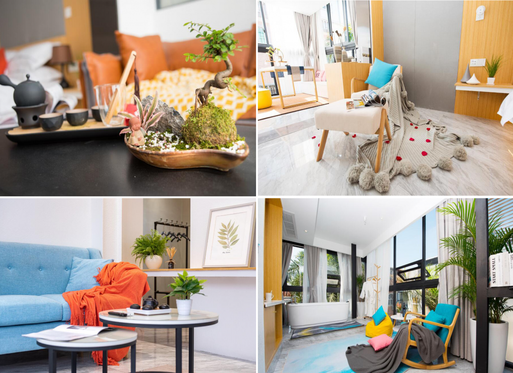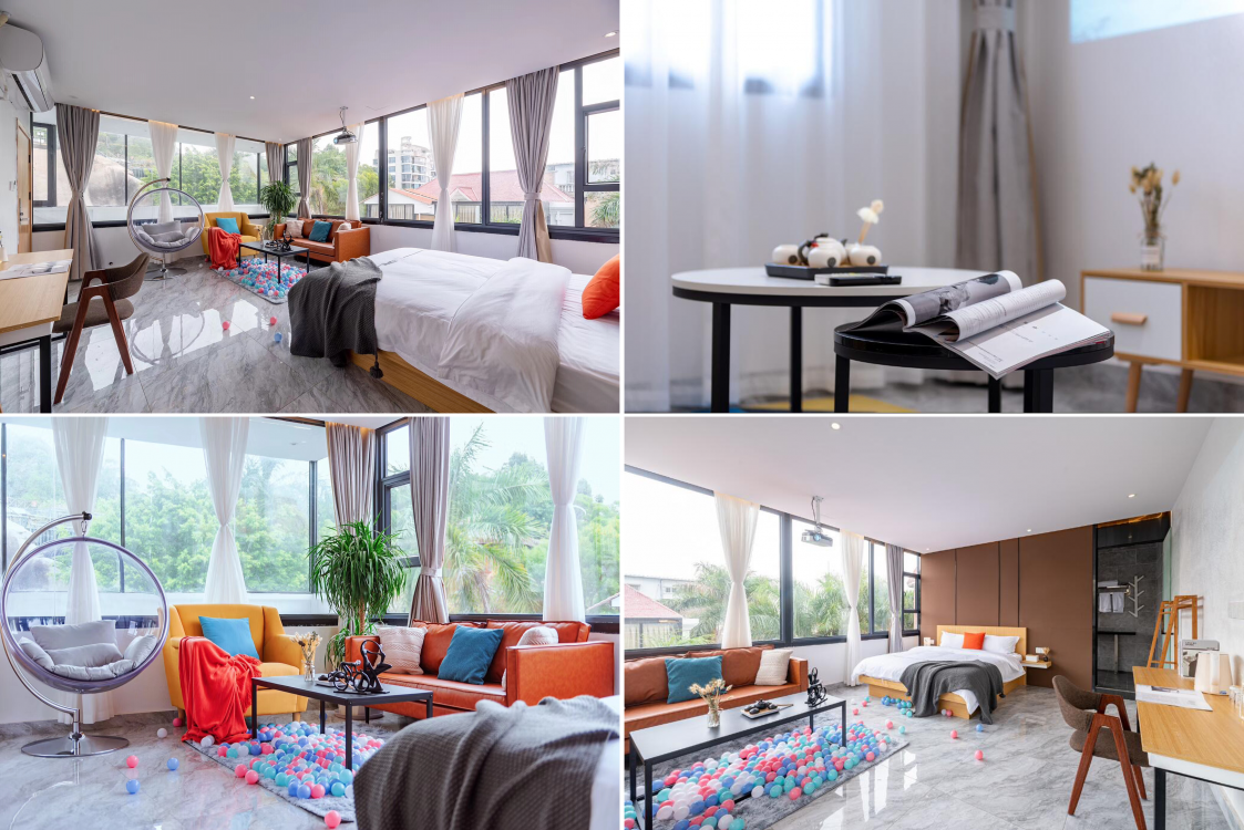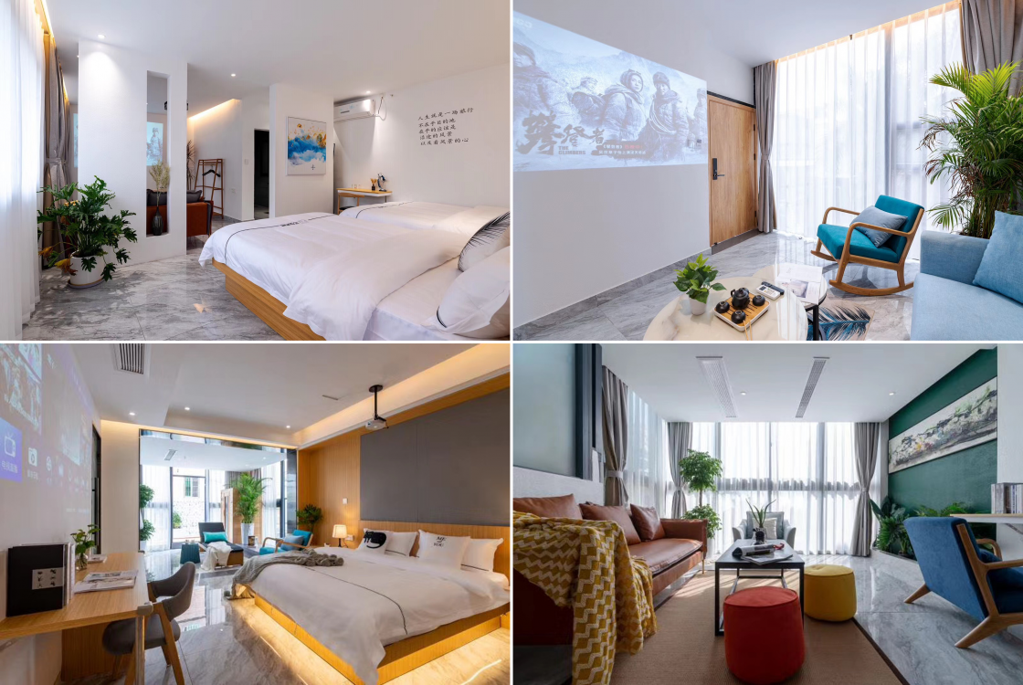 深色与原木色的鲜明色彩对比又在这种沉稳之中增添了些许自然的活力。几件压得住空间的大件家具都是选择了深色系,深色的画作,都使空间显得愈加沉稳饱满,拥有质感的同时,又不失厚重的当代感,没有一丝轻佻的意味。 自然采光略少的卫生间,采用了更为利落、轻盈的手法,与客房形成明显的空间跳跃感。体量不小的边柜,将一切餐用有序地归纳、整洁。 夜归,打开影音设备,躺进赭黄色的沙发...微弱灯光所营造的静谧,让整个空间都笼罩在一种朦胧而耐人寻味的氛围之中,不失为一种纯粹的享受。待天明,大幅的落地玻璃窗,则引入了更多的阳光,整个空间的层次开始丰富、明快起来。 朴 与质 空间中的每一件家具无论在形状还是用材上都有着独特的质感,充满了品位与品质。