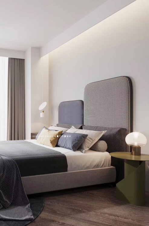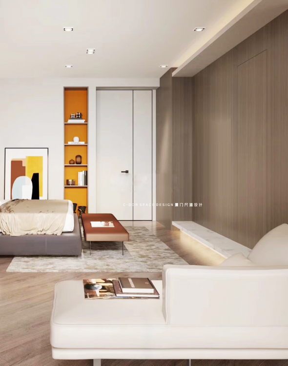 时尚的元素,在品质生活中是必不可少的,其不仅仅是为了装饰而存在,更是为了形成一种真善美的意识,一如本案的Ploum沙发也能体现主人对生活的追求。纯粹的空间在自然美学中营造出低调内敛,极致纯粹的墙面多出一块黄基调,吊顶弧度处理为这个本是有限的空间增添了一丝生动。