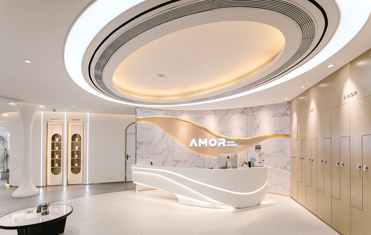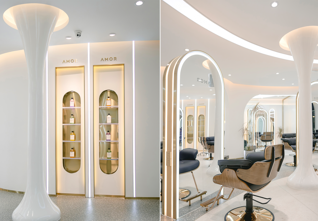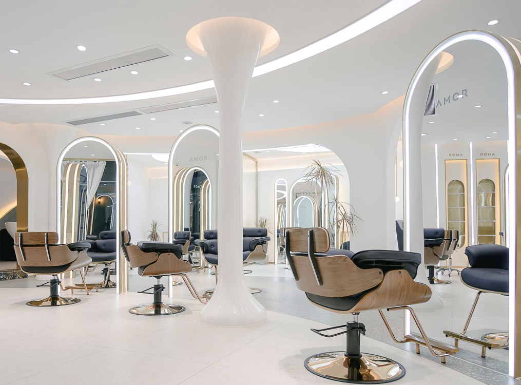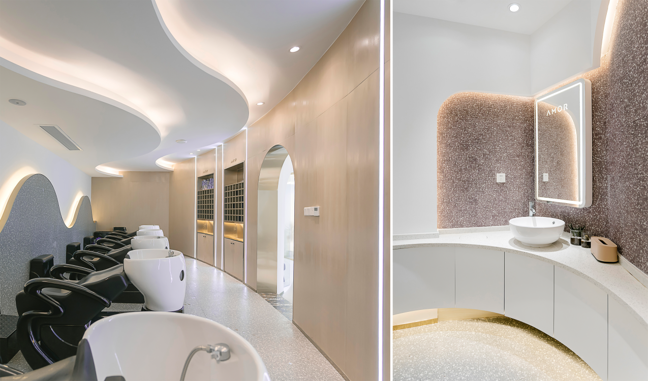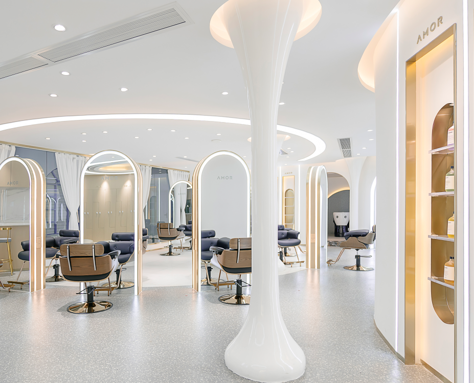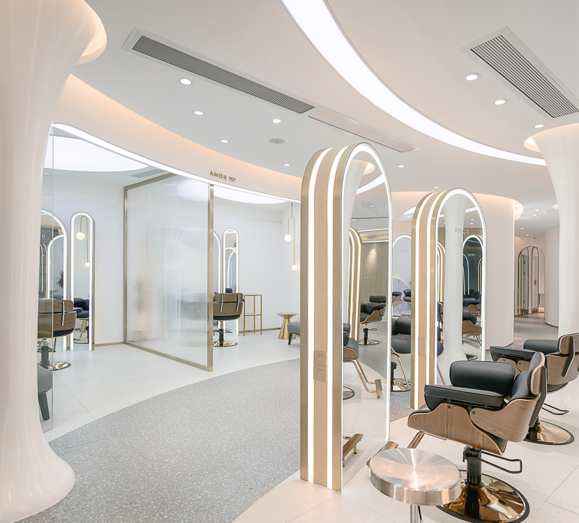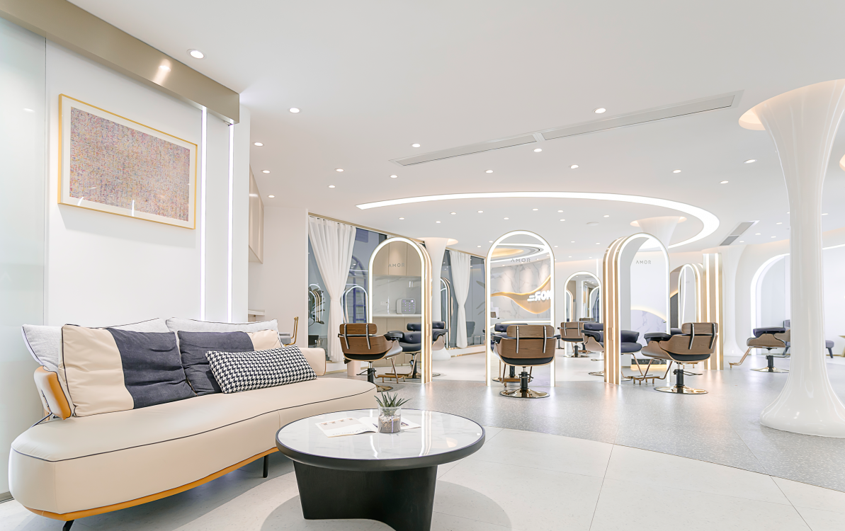 场景体验感是新消费时代的核心,一个轻松、舒适、自由的空间能够让人摒弃杂念放松身心,仿佛身处梦境。不走商业造型空间的常规设计路线,我们有意把前台及等候区设计面积扩大,走进空间的人们感受放松愉悦,忘却烦恼,一切回归从头开始。白色,这种被称为“色盘中调不出来”的颜色,在东西方文化中,都拥有深厚的历史, 无论是绘画、建筑还是时装,白色一直都是最近接艺术本身......梦的尽头,是白色的自由,越是简单的色彩,越能贴合人的内心。本案位于福建省厦门市,面朝大海。本次设计的空间为厦门骏豪会度假私人会所顶层内的一处商铺改造,建筑面积300平方米。主要包括:前台接待区、烫染综合区、等候区、洗头区、水吧等功能。 整个空间设计思想是通过流线形设计语言来展开设计,为了加强室内空间与整个空间相互呼应关系。在整个室内空间设计中,我们通过利用大量的不规则与规则的结构进行创意设计。整体空间动线不拘泥于以往美发空间的横平竖直,更多的是采用弧形、椭圆形和拱形的造型立意,体现一种引导性更强又充满动感的视觉体验,弧线型动线的设计同时也更加能够彰显行业的本质。在设计之初我们想给予空间自由感,因此选择了大面积的白色调,同时量身定制的理发镜台运用到镜面材质,映射出室内环境的同时也为静态的空间赋予动态的视觉感,人影在行走时若影若现,真实与虚无在镜像里相互交织,仿佛在有形与无形之中穿梭着,空间体验与设计的微妙关系我们相信它们在某些本质意义上是一样的,使人不再同动物一般完全与自然融为一体,而是有所区隔。