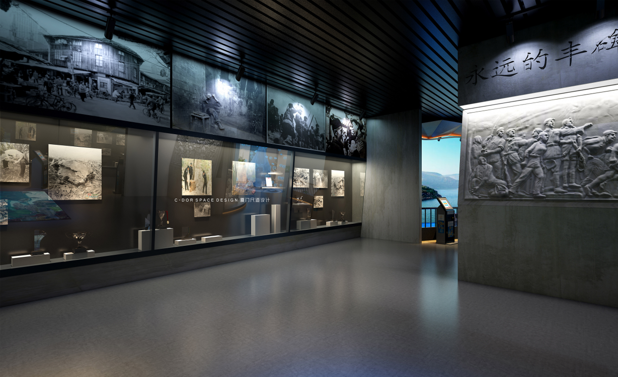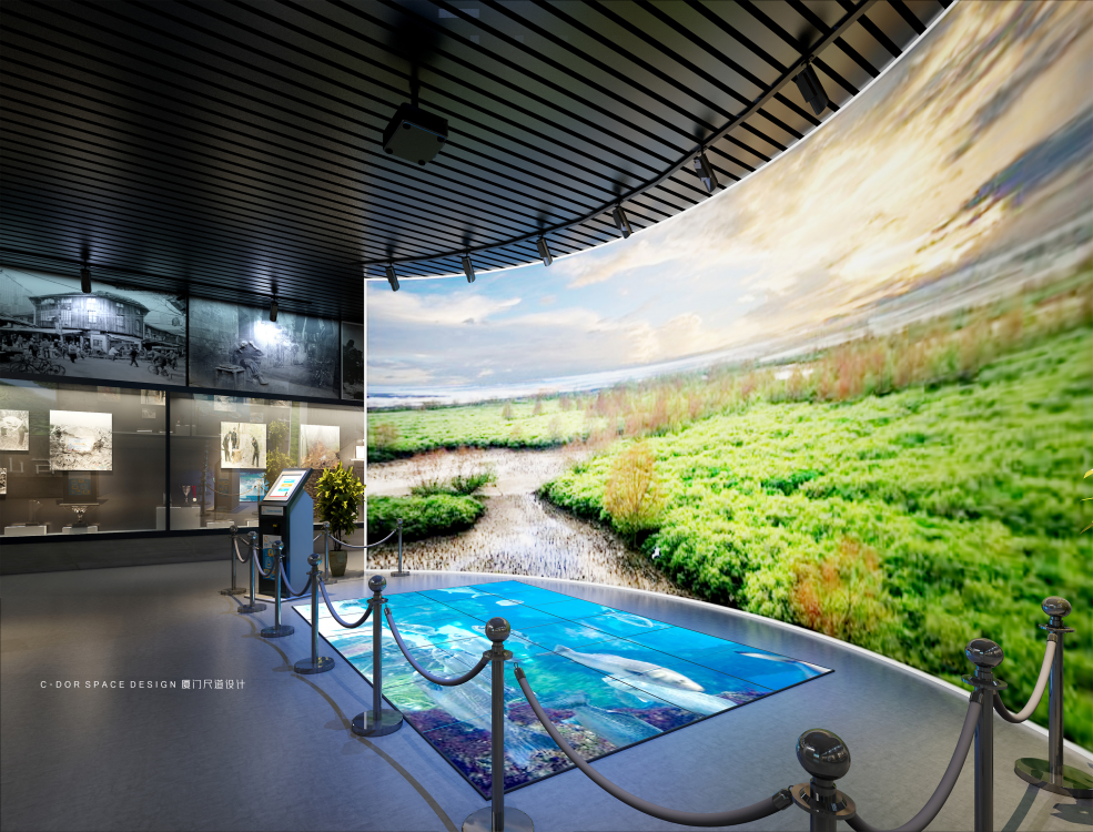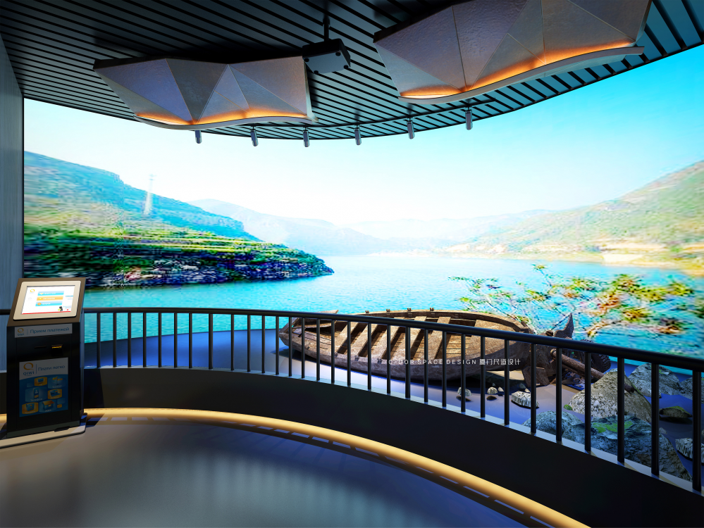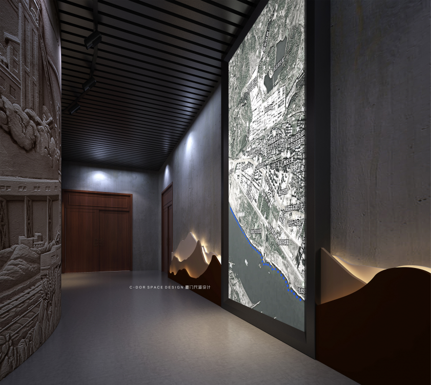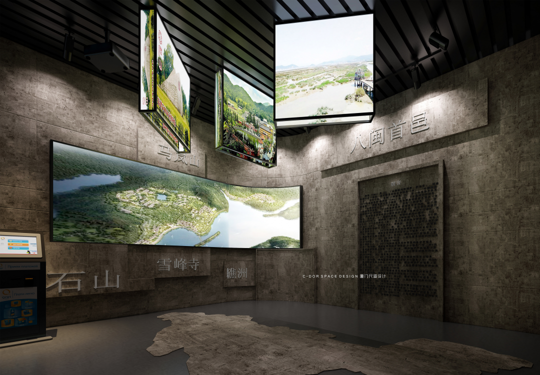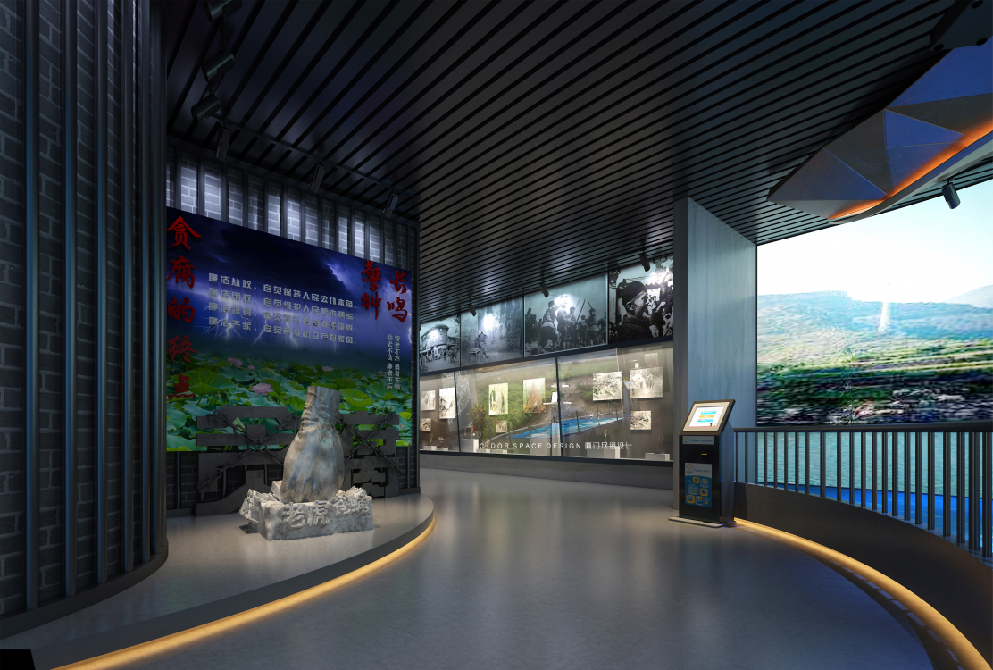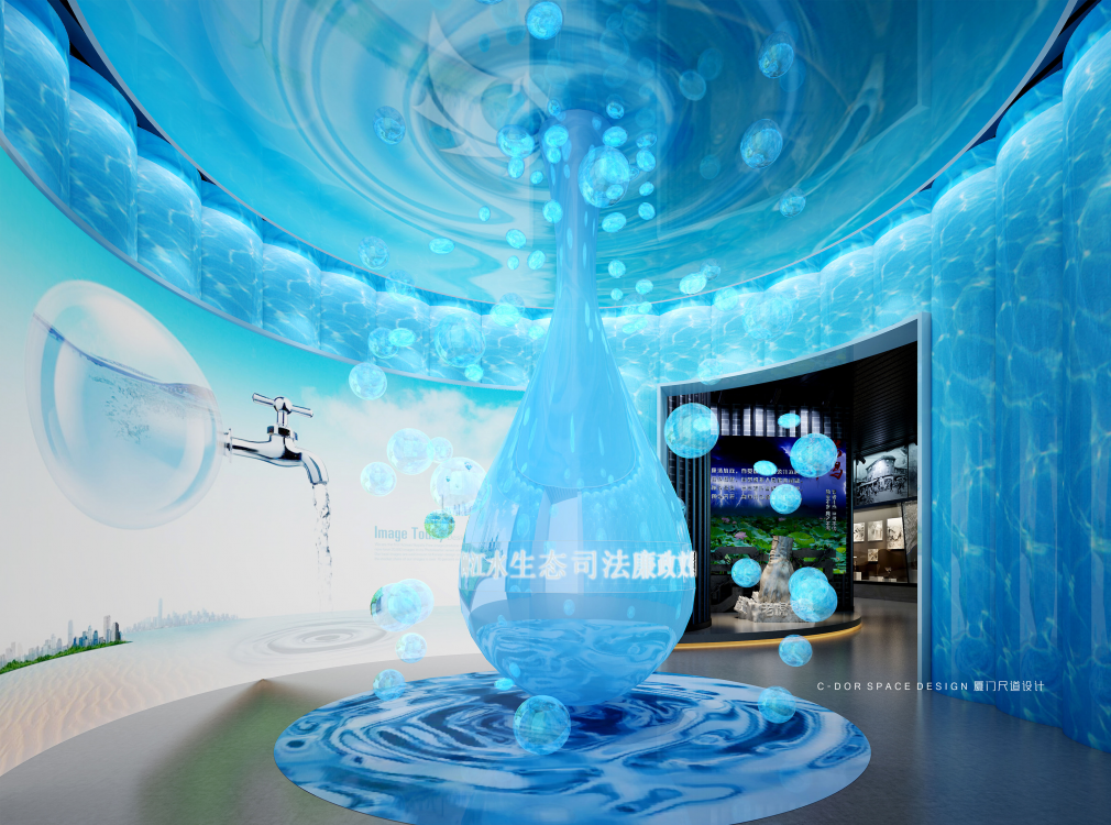 1. 以水的动态流动形式为起点构思空间形态,建筑一层每年会被闽江洪水淹没,因此本层我们以艺术雕塑、普法走廊等形式,宣传水生态治理、依法治国理念、廉政自律等内容,结合本地人文特色及历史文化,全方位展示闽侯县的生态文明、精神文明、物质文明。波浪形休息长椅结合水的形态元素立意;展厅入口围绕水滴造型体现节约水资源、保护水生态为主题,增强人们对保护生态资源的意识。从展厅入口处以弧形动线延伸至沙盘区,抬高处暗藏灯带多了一丝灵动感,通过电子沙盘、触控屏幕介绍闽江流域生态治理的工作动态;纪委建委廉政展示区我们以冰冷的黑钢和醒目的囚牢以及反腐雕塑标志烘托空间的沉重感,起到警钟长鸣的暗示作用;实物展示区以博物馆展柜形式配合灯光,反映盗采滥伐的历史事件,包括老照片、奖状奖杯等实物,体现水上执法的重要性;悬挂式屏幕展示闽江流域的工作治理情况,墙面造型采用浮雕以及石板刻字介绍闽侯山体山貌,体现“青山绿水就是金山银山”的重要讲话。整个建筑空间的尽头是水域分布展示区,我们以波浪式墙面造型结合灯带形式展示水域流动的形态,矗立的福建水域分布图造型通过蓝色变换的小型灯带划分闽江的详细位置,水生态保护不分地域不分跨度,以闽江治理工作为先锋榜样,构建全国性水生态资源司法保护新格局。
